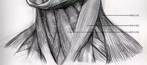 颈部的肌肉较多,对于绘画来说只要掌握三块就好:斜方肌、胸锁乳突肌和肩胛提肌。斜方肌影响颈部的只有上部分,从颅骨下方连接到肩胛骨,再向前绕到锁骨包裹住锁骨的一部分,当斜方肌收紧时,头部后仰;胸锁乳突肌从耳后的乳突骨向下分别连接锁骨和胸骨,当胸锁乳突肌收紧时,头部前俯;肩胛提肌一头连接颈椎一头连接肩胛骨,但前方被胸锁乳突肌覆盖后方被斜方肌覆盖,只有三分之一在体表面。